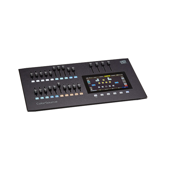 ETC ColorSource 20 & ETC ColorSource 40 • ColorSource 20: 20 faders and 40 control channels (dimmers or multi-parameter devices) • ColorSource 40: 40 faders and 80 control channels (dimmers or multi-parameter devices) • Four configurable sliders, five configurable soft-keys and a home button • 17.8 cm multi-touch screen for information display, control of moving light parameters and data entry • One 5-pin XLR DMX/RDM port • One USB port
