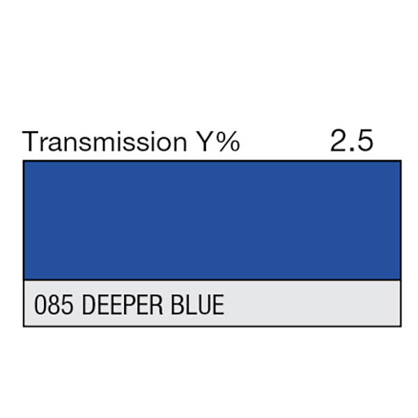 LEE 085 Deeper Blue is a deep warm blue. Good for back and side lighting. Full sheet dimensions are 1.22m x 0.53m.