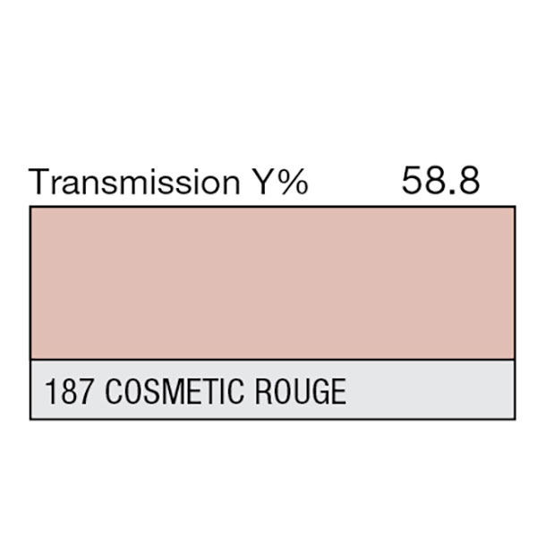 LEE 187 Cosmetic Rouge creates a warm highlight leaning toward apricot, good for warm front light, complimentary to most skin tones, beware of use on pale skin: tends to look pink. Full sheet dimensions are 1.22m x 0.53m.