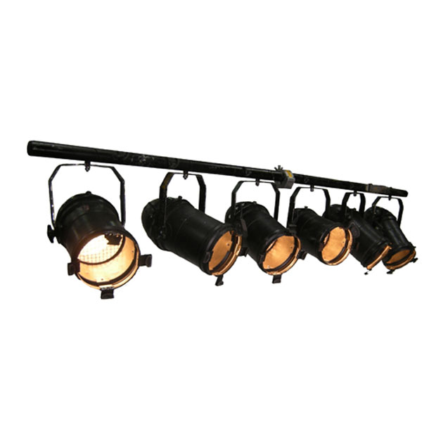 Parcan 6 lamp bar complete with 6 x 1000w Black Parcans bolted to a 7′ 6″ scaffold bar with Lectriflex connector.