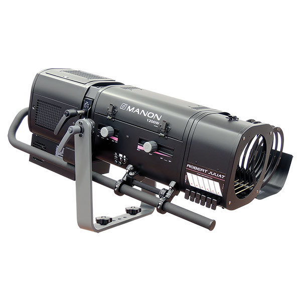 Robert Juliat Manon followspot with 1200 Watt MSR discharge lamp, followspot stand, integral iris and mechanical dimmer and an integral hand operated colour changer
