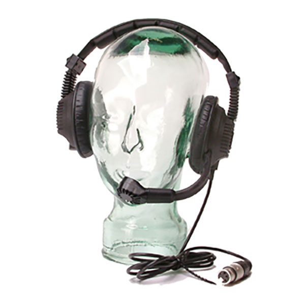 Double muff, heavy duty closed-cup type with a fixed, flexible moulded boom-arm, housing a noise cancelling dynamic mic.